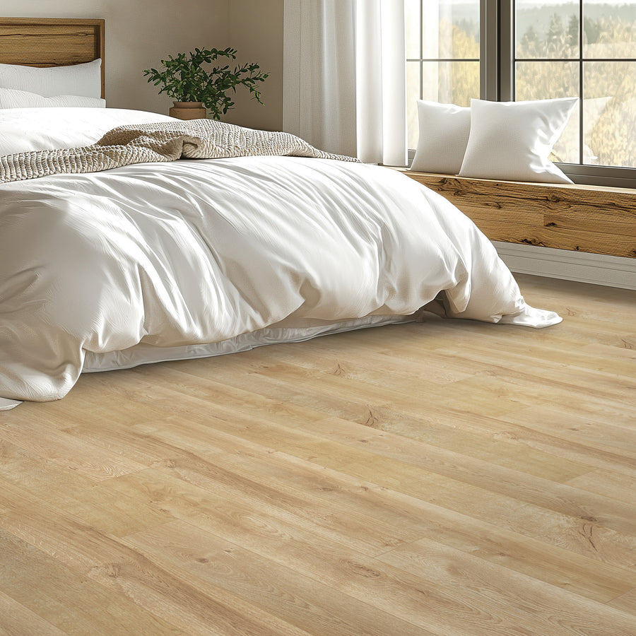 Birkhall Landing 7.5" Waterproof Laminate combines elegant design with practical durability, perfect for households with pets. Its waterproof surface ensures easy cleaning and resistance to spills, while the wide planks provide a luxurious, spacious feel. This flooring offers a refined look without compromising on toughness, making it an ideal choice for sophisticated homes that demand both style and functionality.