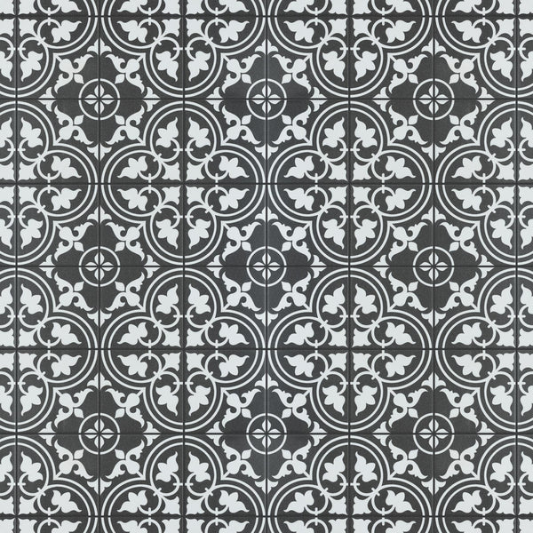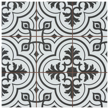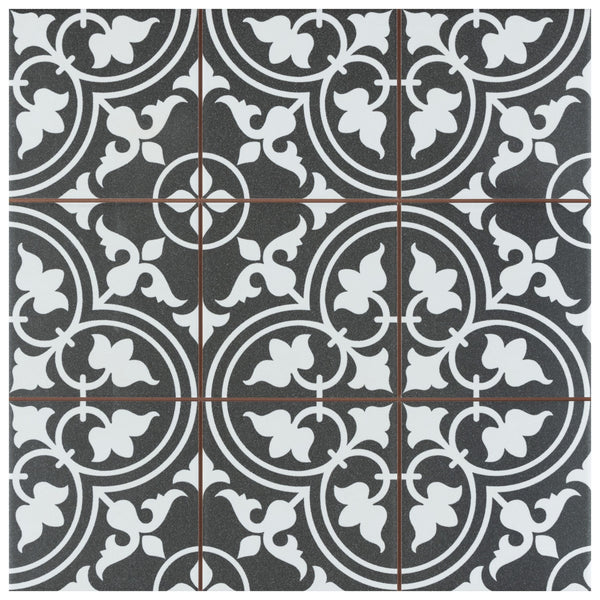 Our Harmonia Classic Black 13 in. x 13 in. Ceramic Floor and Wall Tile creates the look of a stunning leading-edge mosaic-like design with the harmonious, easy installation of a square tile. Inspired by our best-selling Arte Black, this ceramic encaustic-inspired tile similarly features floral old-world patterns in snow white that frames dueling arcs in the center, offering subtle contrast and dimension to the decoration. Set on the highest-quality charcoal black base glaze, the contrasting design features a weathered, speckled look, replicating the beauty of its cement muse. The floral, geometric pattern blends into virtually any design theme, making this an exceptional product for modern installations and historic renovations. Save time and labor spent arranging mosaic sheets and instead install these durable ceramic slabs, which have squares separated by scored grout lines. The scored grout lines can be grouted with the color of your choice to further customize your installation.