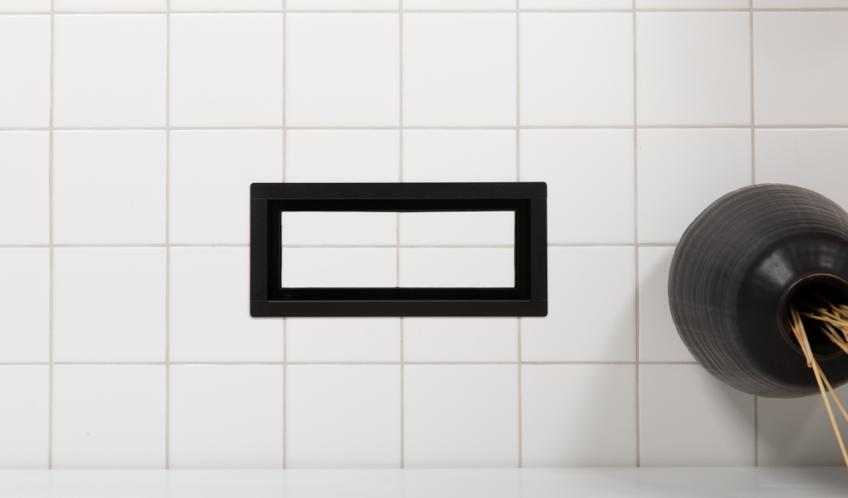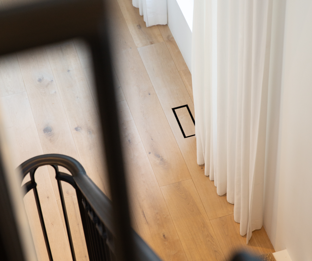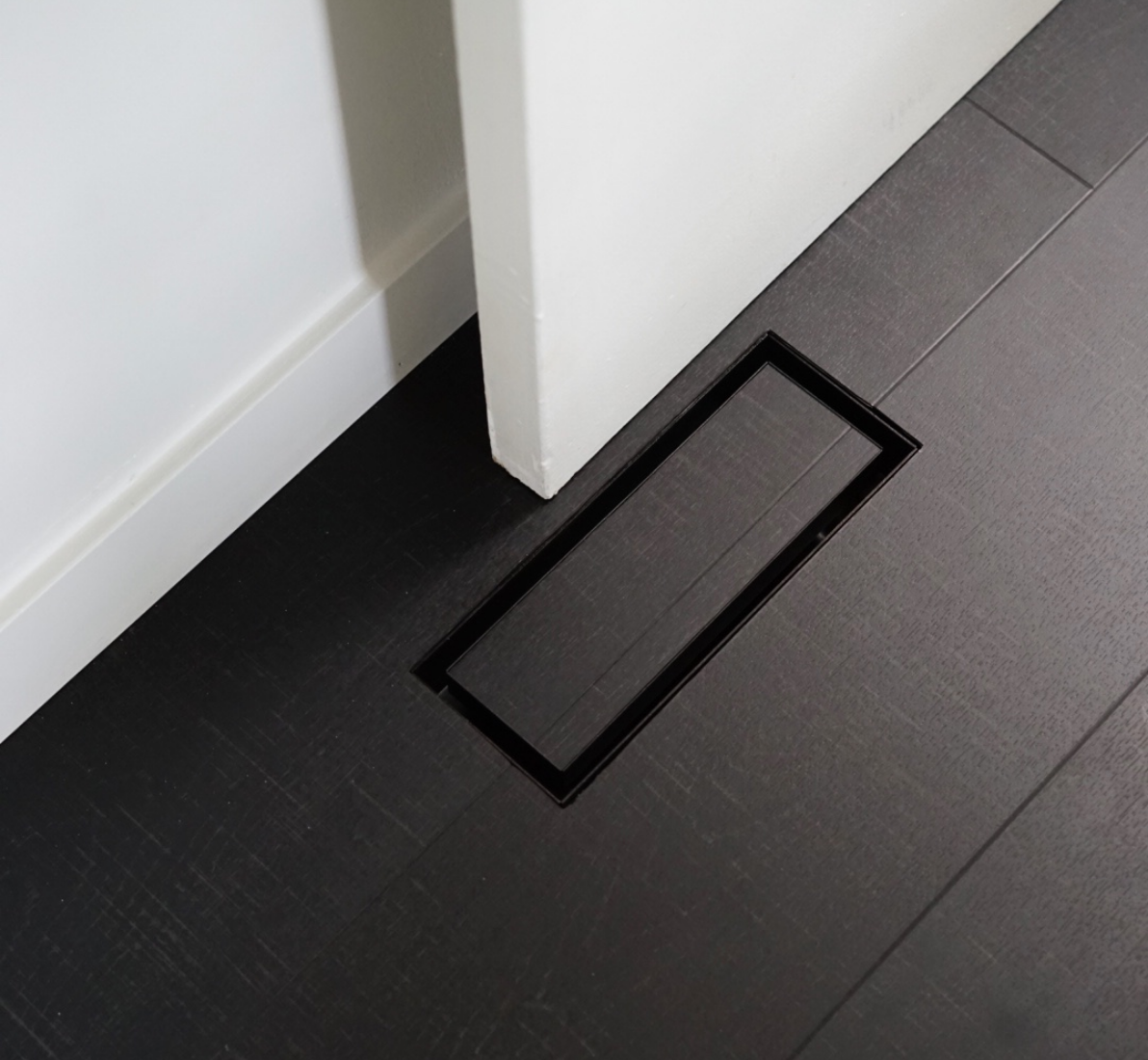 The original minimalist framed floor vent. Once installed, only the framed rim and rectangular air channel are visible. Customizable with every surface material and can be installed at any time.